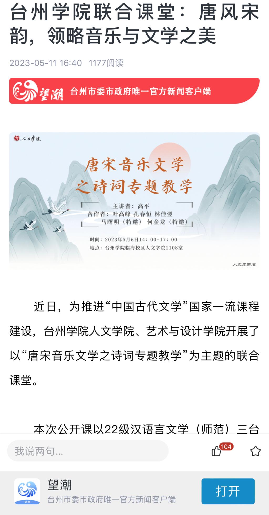 近日,为推进“中国古代文学”国家一流课程建设,台州学院人文学院、艺术与设计学院开展了以“唐宋音乐文学之诗词专题教学”为主题的联合课堂。