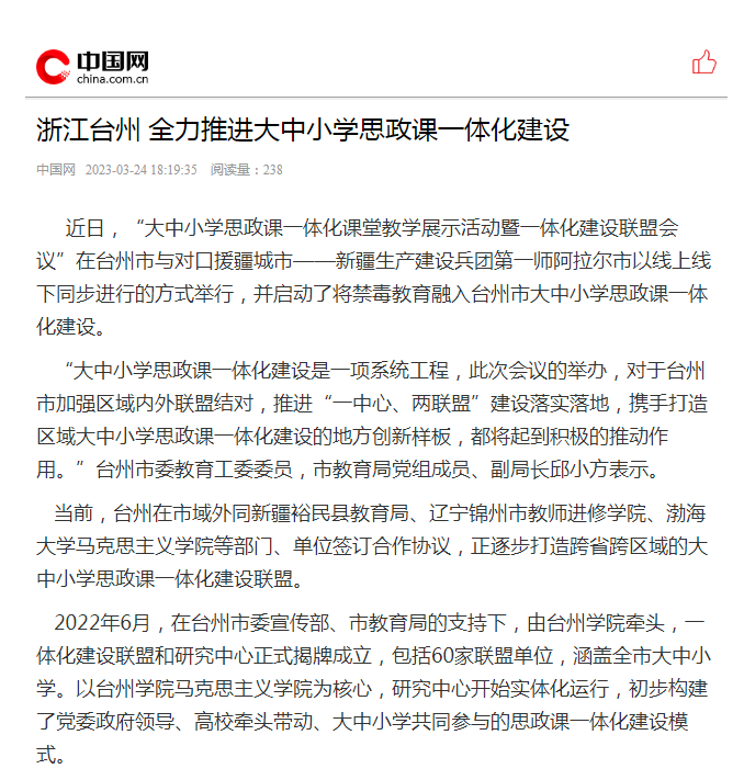2022年6月,在台州市委宣传部、市教育局的支持下,由台州学院牵头,一体化建设联盟和研究中心正式揭牌成立,包括60家联盟单位,涵盖全市大中小学。以台州学院马克思主义学院为核心,研究中心开始实体化运行,初步构建了党委政府领导、高校牵头带动、大中小学共同参与的思政课一体化建设模式。