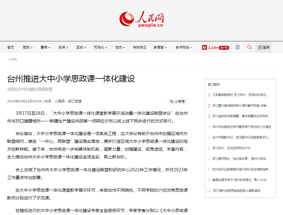 3月17日至18日,“大中小学思政课一体化课堂教学展示活动暨一体化建设联盟会议”在台州市与对口援疆城市——新疆生产建设兵团第一师阿拉尔市以线上线下同步进行的方式举行。