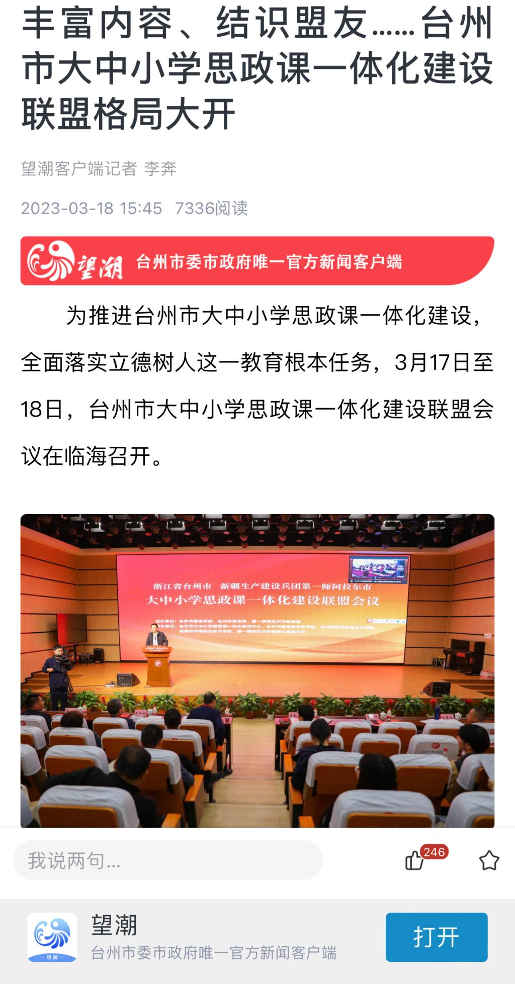 2022年6月,在台州市委宣传部、市教育局的领导下,台州学院牵头成立了台州市大中小学思政课一体化建设联盟和研究中心。近一年来,联盟和研究中心开展了系列一体化活动,努力探索不同学段思政课一体化育人的新模式,形成了具有台州特色和优势的一体化建设经验和成果。