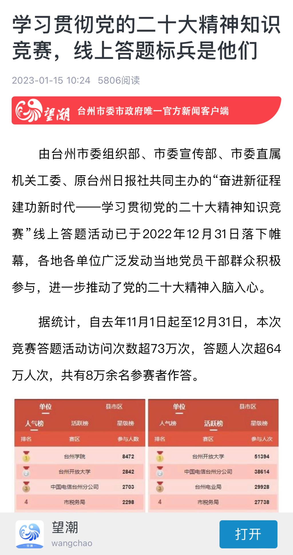 由台州市委组织部、市委宣传部、市委直属机关工委、原台州日报社共同主办的“奋进新征程 建功新时代——学习贯彻党的二十大精神知识竞赛”线上答题活动已于2022年12月31日落下帷幕,各地各单位广泛发动当地党员干部群众积极参与,进一步推动了党的二十大精神入脑入心。