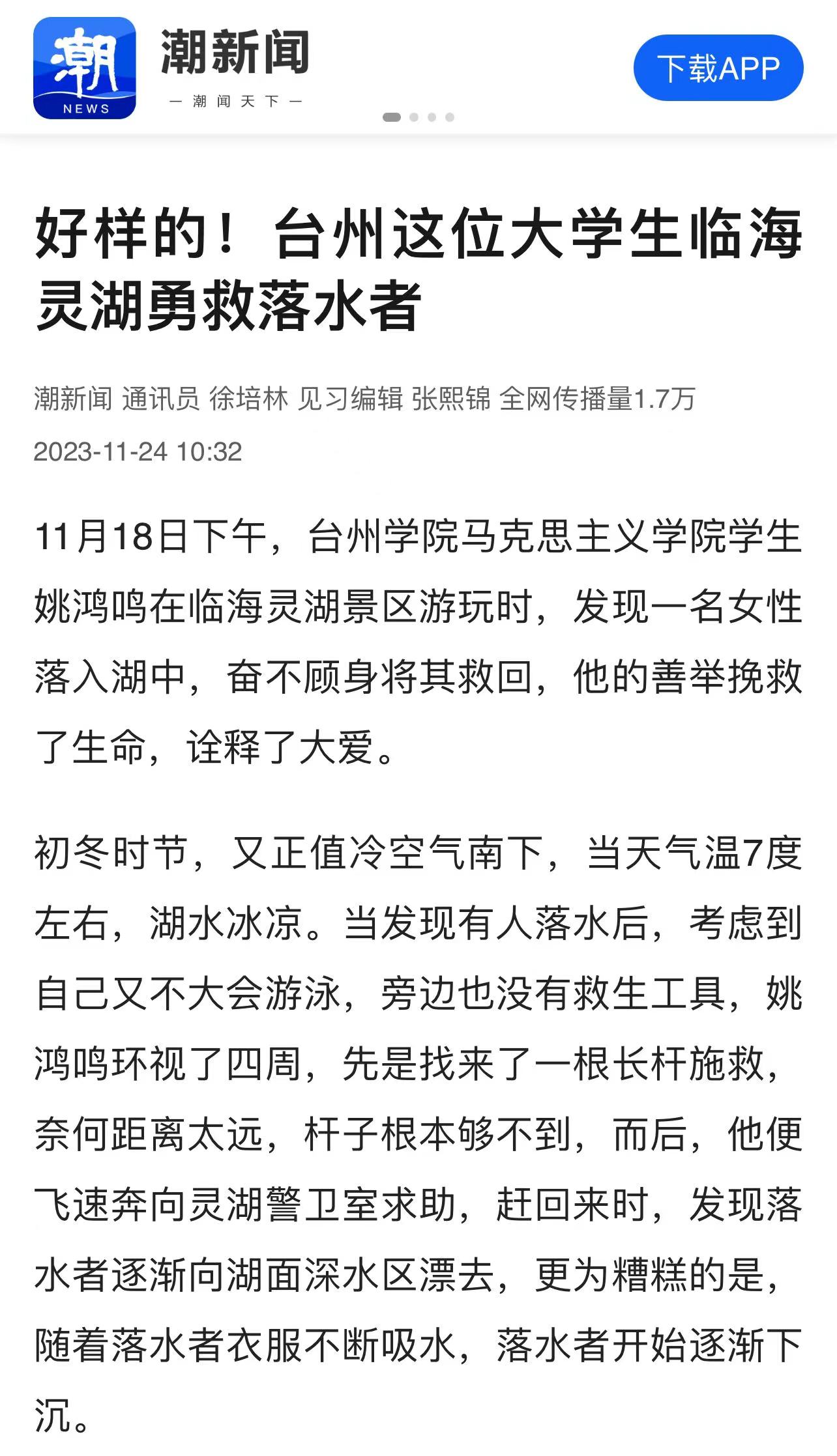 11月18日下午,台州学院马克思主义学院学生姚鸿鸣在临海灵湖景区游玩时,发现一名女性落入湖中,奋不顾身将其救回,他的善举挽救了生命,诠释了大爱。