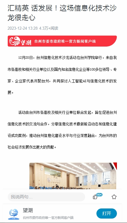 12月20日,台州信息化技术沙龙活动在台州学院举行,来自我市各高校和相关行业单位以及国内知名信息化企业等100多位领导、专家、企业家代表齐聚台州,共同探讨人工智能AI与信息化技术的发展。