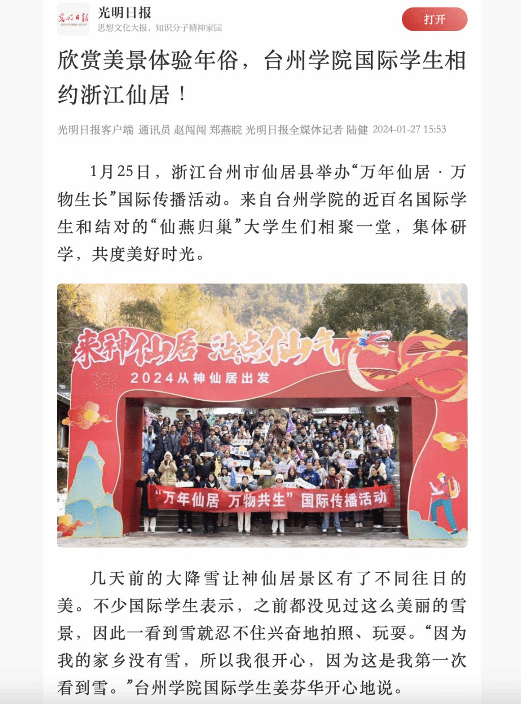 1月25日,浙江台州市仙居县举办“万年仙居·万物生长”国际传播活动。来自台州学院的近百名国际学生和结对的“仙燕归巢”大学生们相聚一堂,集体研学,共度美好时光。