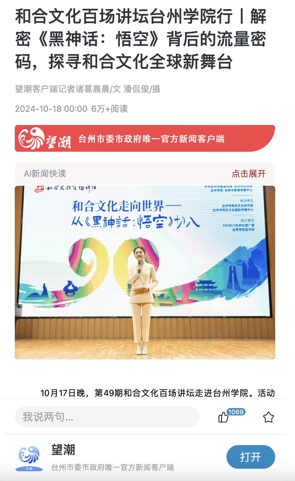 台州学院人文社科处处长高平作题为“从《西游记》到《黑神话:悟空》”的演讲,他指出:“电子游戏《黑神话:悟空》作为优秀传统文化融合的典范之作,体现了东方大国的文化自信。游戏走红为和合文化走向世界提供了美好愿景。”