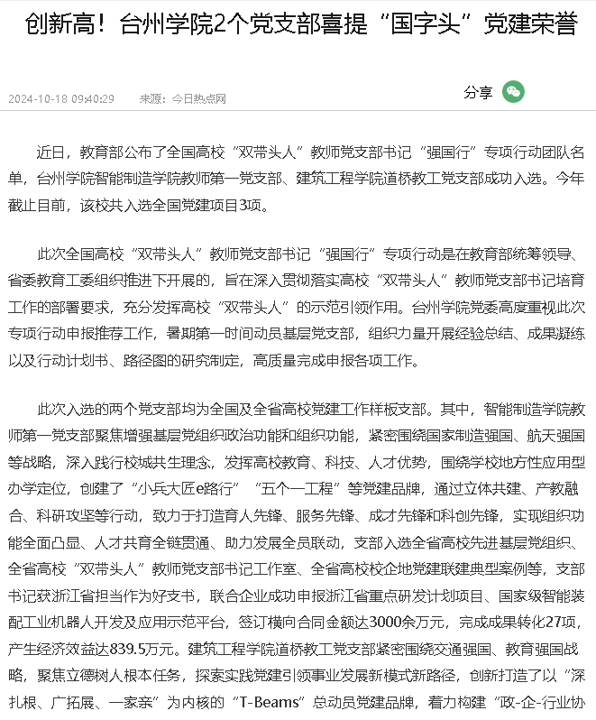 此次入选的两个党支部均为全国及全省高校党建工作样板支部。其中,智能制造学院教师第一党支部聚焦增强基层党组织政治功能和组织功能,紧密围绕国家制造强国、航天强国等战略,深入践行校城共生理念,发挥高校教育、科技、人才优势,围绕学校地方性应用型办学定位,创建了“小兵大匠e路行”“五个一工程”等党建品牌,通过立体共建、产教融合、科研攻坚等行动,致力于打造育人先锋、服务先锋、成才先锋和科创先锋,实现组织功能全面凸显、人才共育全链贯通、助力发展全员联动,支部入选全省高校先进基层党组织、全省高校“双带头人”教师党支部书记工作室、全省高校校企地党建联建典型案例等,支部书记获浙江省担当作为好支书,联合企业成功申报浙江省重点研发计划项目、国家级智能装配工业机器人开发及应用示范平台,签订横向合同金额达3000余万元,完成成果转化27项,产生经济效益达839.5万元。建筑工程学院道桥教工党支部紧密围绕交通强国、教育强国战略,聚焦立德树人根本任务,探索实践党建引领事业发展新模式新路径,创新打造了以“深扎根、广拓展、一家亲”为内核的“T-Beams”总动员党建品牌,着力构建“政-企-行业协会-学校-实验平台”五位一体的产教融合协同育人联合体,为地方道路桥梁建设发展输送了大量的高素质人才、提供了大量的专业技术服务,完成全国8000多座桥梁检测评定工作,成果应用于500多座桥梁加固工程,为交通部门节约资金逾4亿元;强化实践服务反哺育人,学生创新创业等荣获包括全国大学生结构竞赛等25项国家级奖项、浙江省大学生力学竞赛等96项省级奖项,被誉为桥梁管理和人才培养的“台州模式”,入选全省高校“双带头人”教师党支部书记工作室,相关做法受到新华社、《光明日报》、《中国教育报》等多次报道。