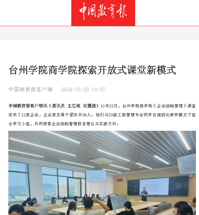 中国教育报客户端讯(通讯员 王呈斌 刘慧星)10月23日,台州学院商学院《企业战略管理》课堂迎来了12家企业,企业家及骨干团队共38人。他们与23级工商管理专业同学在混班化教学模式下组成学习小组,共同探索企业战略管理前沿理论与实践方向。