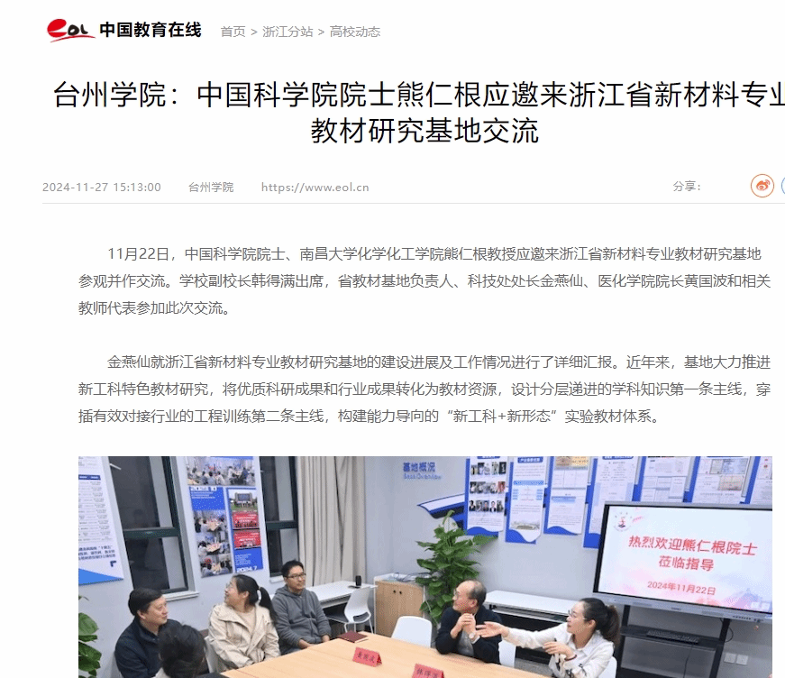 11月22日,中国科学院院士、南昌大学化学化工学院熊仁根教授应邀来浙江省新材料专业教材研究基地参观并作交流。学校副校长韩得满出席,省教材基地负责人、科技处处长金燕仙、医化学院院长黄国波和相关教师代表参加此次交流。
