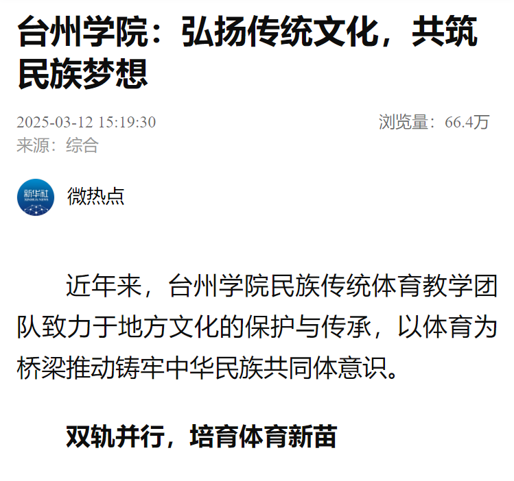 近年来,台州学院民族传统体育教学团队致力于地方文化的保护与传承,以体育为桥梁推动铸牢中华民族共同体意识。