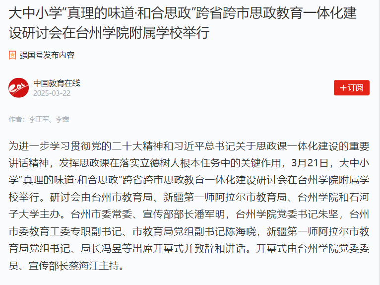 大中小学“真理的味道·和合思政”跨省跨市思政教育一体化建设研讨会在台州学院附属学校举行