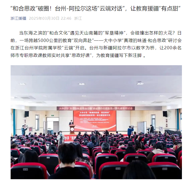 当东海之滨的“和合文化”遇见天山南麓的“军垦精神”,会碰撞出怎样的火花?日前,一场跨越5000公里的教育“双向奔赴”——大中小学“真理的味道·和合思政”研讨会在浙江台州学院附属学校“云端”开启。台州与新疆阿拉尔市以数字为桥,让200余名师市专职思政课教师实时共享“思政好课”,为教育援疆写下新注脚 。