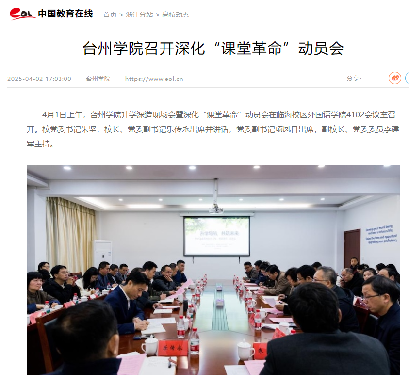 4月1日上午,台州学院升学深造现场会暨深化“课堂革命”动员会在临海校区外国语学院4102会议室召开。校党委书记朱坚,校长、党委副书记乐传永出席并讲话,党委副书记项凤日出席,副校长、党委委员李建军主持。
