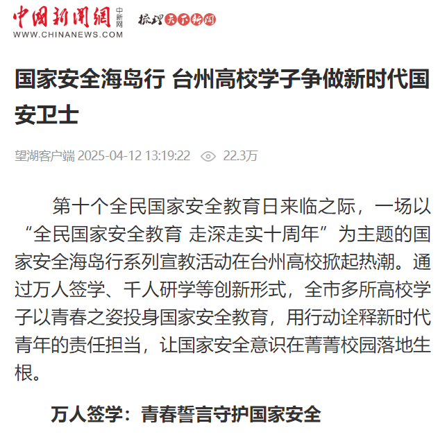 第十个全民国家安全教育日来临之际,一场以“全民国家安全教育 走深走实十周年”为主题的国家安全海岛行系列宣教活动在台州高校掀起热潮。通过万人签学、千人研学等创新形式,全市多所高校学子以青春之姿投身国家安全教育,用行动诠释新时代青年的责任担当,让国家安全意识在菁菁校园落地生根。