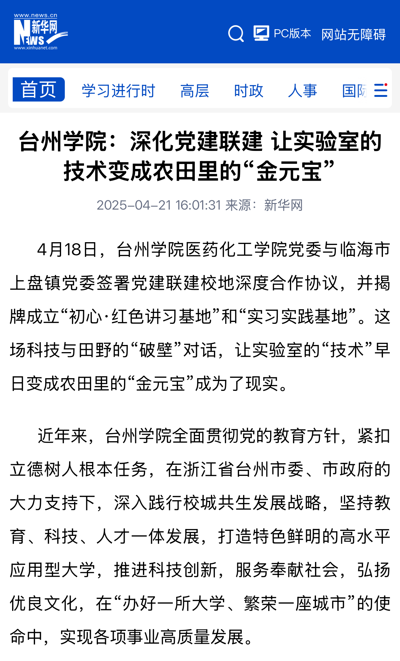 目前学校拥有硕士学位授权点17个,6个学科进入ESI全球排名前1%。其中,医药化工学院是该校综合实力最强的标杆院系。台州学院医药化工学院党委书记徐元红表示,学院将推动“高校+村集体+企业+农户”模式创新,打造“共富工坊”“小支部对接大农业”等党建服务品牌,孵化一批既懂技术又接地气的“田专家”“土秀才”。