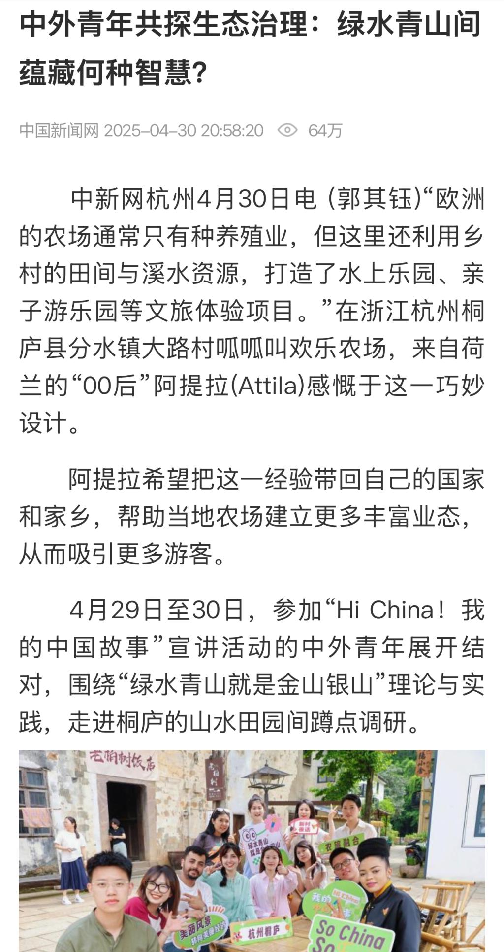 4月29日至30日,参加“Hi China!我的中国故事”宣讲活动的中外青年展开结对,围绕“绿水青山就是金山银山”理论与实践,走进桐庐的山水田园间蹲点调研。