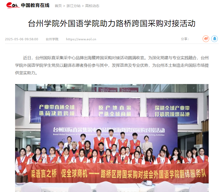 近日,台州国际直采集采中心品牌出海暨跨国采购对接活动圆满收官。为深化党建与专业实践融合,台州学院外国语学院学生党员以翻译志愿者身份参与其中,发挥语言及专业优势,为台州本土制造走向国际市场提供坚实助力。