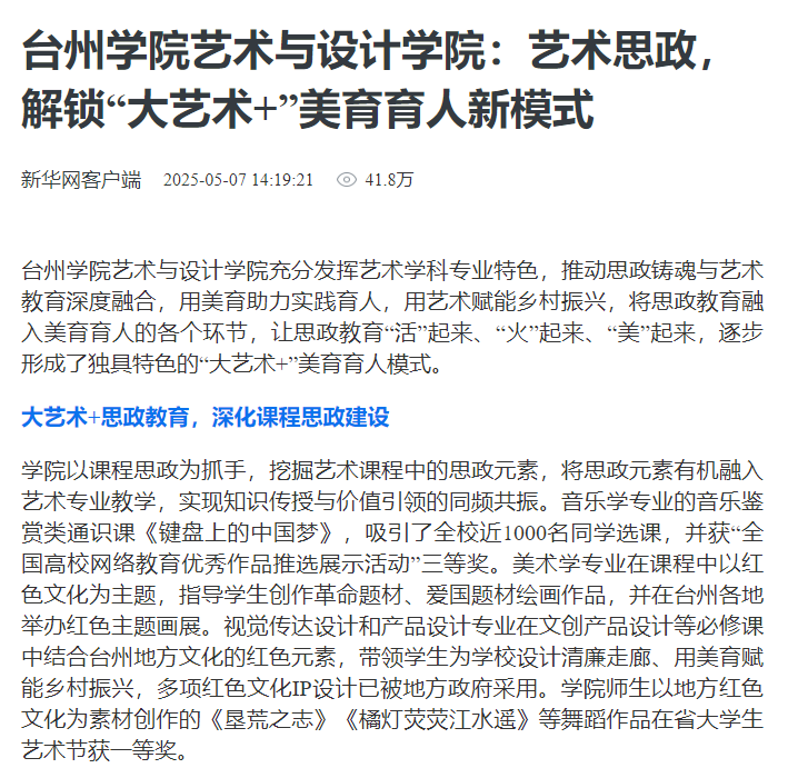 台州学院艺术与设计学院充分发挥艺术学科专业特色,推动思政铸魂与艺术教育深度融合,用美育助力实践育人,用艺术赋能乡村振兴,将思政教育融入美育育人的各个环节,让思政教育“活”起来、“火”起来、“美”起来,逐步形成了独具特色的“大艺术+”美育育人模式。