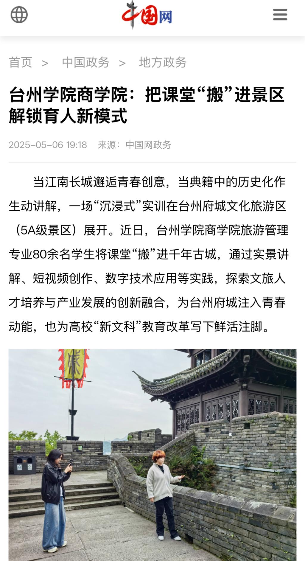 据悉,台州学院商学院旅游管理专业为国家级一流本科专业建设点。近年来,该专业深化“新文科”改革,通过“课程植入景区、师资对接行业”等举措,构建起“校地协同、产教融合”的育人体系。校方与台州府城文化旅游区共建实践基地,计划将学生创意纳入景区智慧导览系统,持续为古城焕新赋能。正如带队教师所言:“最好的课堂在路上。”当千年城墙成为教学现场,当青春智慧碰撞历史遗产,这场沉浸式实训不仅书写着未来文旅人的成长轨迹,更昭示着教育链、人才链与产业链深度融合的广阔前景。