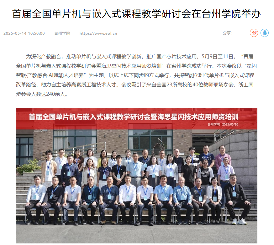 为深化产教融合,推动单片机与嵌入式课程教学创新,推广国产芯片技术应用,5月9日至11日,“首届全国单片机与嵌入式课程教学研讨会暨海思星闪技术应用师资培训”在台州学院成功举行。本次会议以“星闪智联·产教融合·AI赋能人才培养”为主题,以线上线下同步的方式举行,共探智能化时代单片机与嵌入式课程改革路径,助力自主培养高素质工程技术人才。会议吸引了来自全国23所高校的40位教师现场参会,线上同步参会人数达240余人。