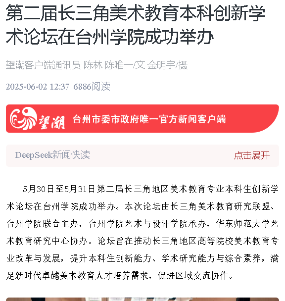 5月30日至5月31日第二届长三角地区美术教育专业本科生创新学术论坛在台州学院成功举办。本次论坛由长三角美术教育研究联盟、台州学院联合主办,台州学院艺术与设计学院承办,华东师范大学艺术教育研究中心协办。论坛旨在推动长三角地区高等院校美术教育专业改革与发展,提升本科生创新能力、学术研究能力与综合素养,满足新时代卓越美术教育人才培养需求,促进区域交流协作。
