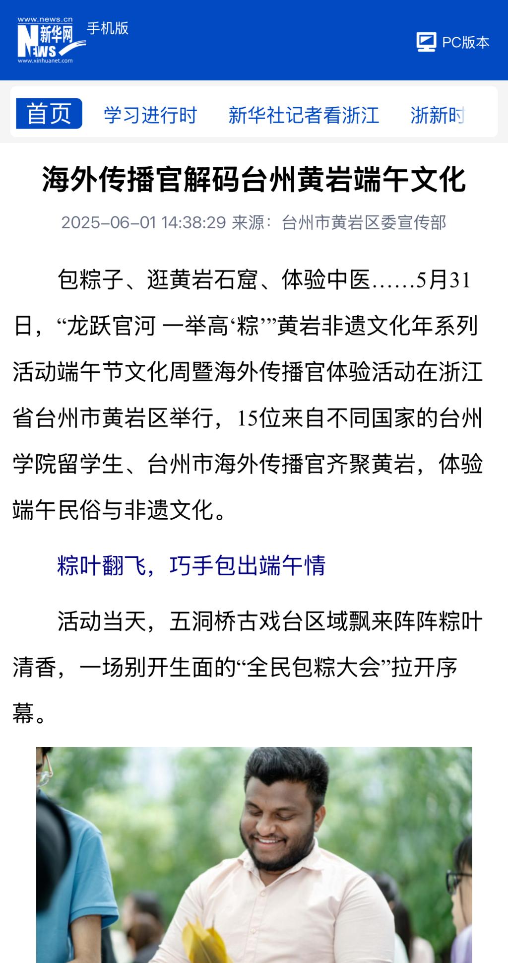 包粽子、逛黄岩石窟、体验中医……5月31日,“龙跃官河 一举高‘粽’”黄岩非遗文化年系列活动端午节文化周暨海外传播官体验活动在浙江省台州市黄岩区举行,15位来自不同国家的台州学院留学生、台州市海外传播官齐聚黄岩,体验端午民俗与非遗文化。