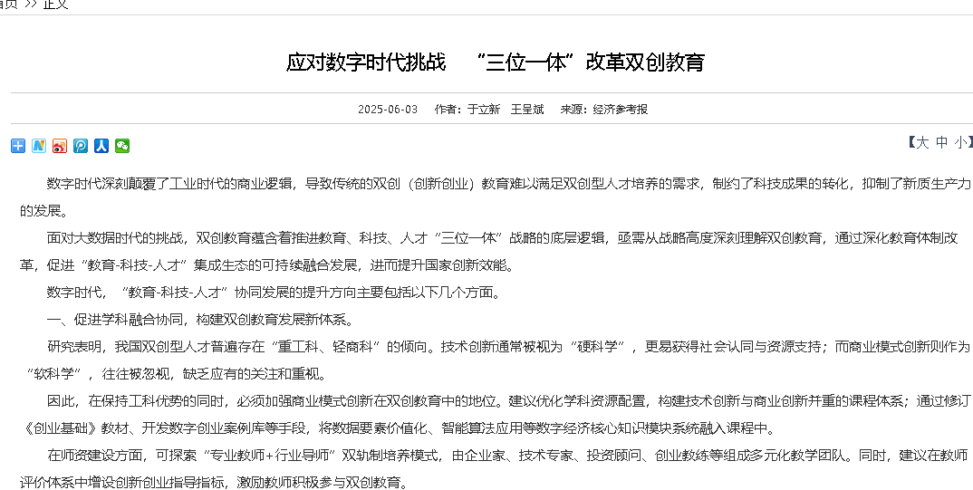 应对数字时代挑战 “三位一体”改革双创教育