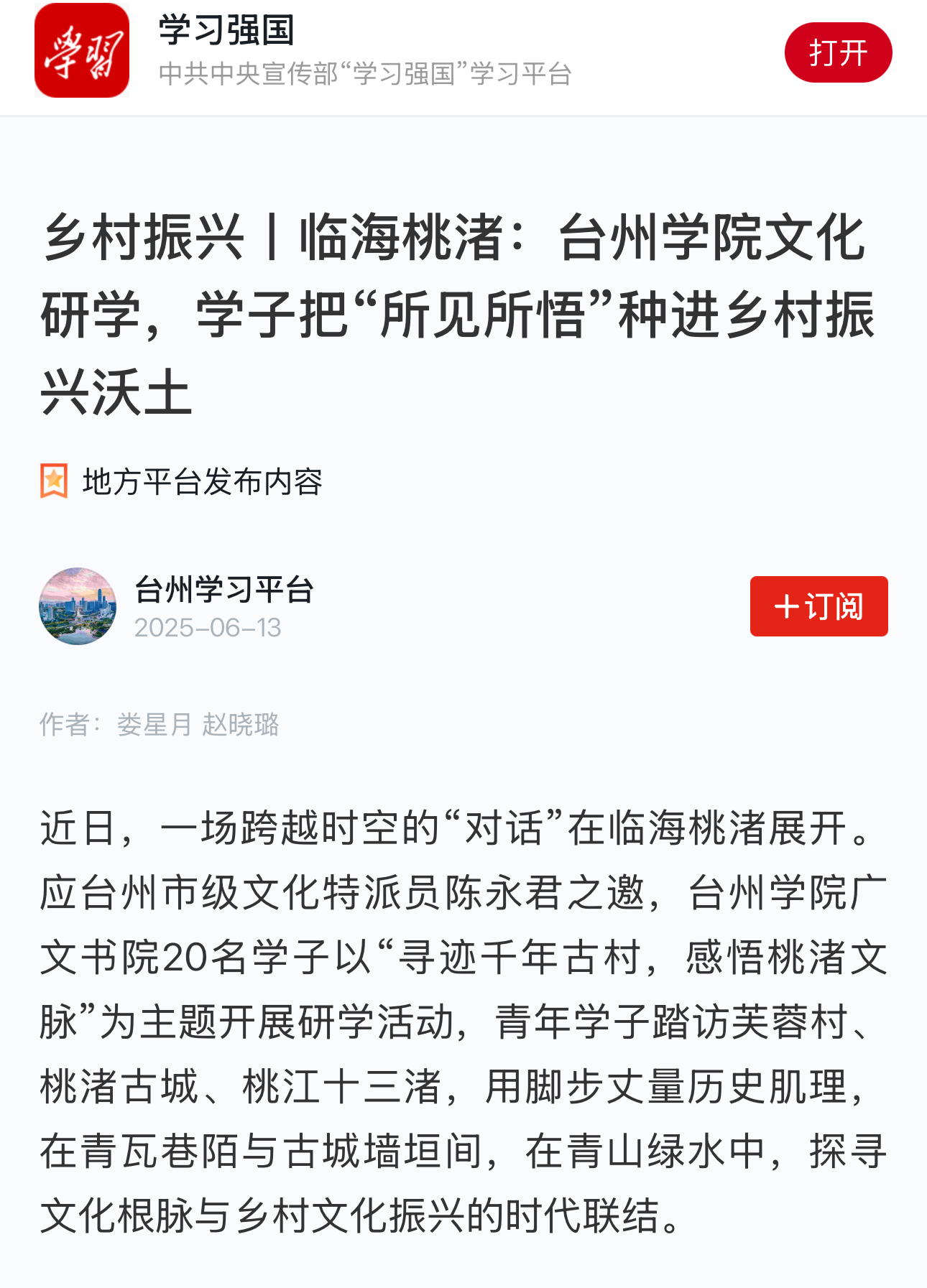 如今的桃渚,正用“左手牵历史、右手握未来”的姿态奔跑——而这群年轻学子的脚步,或许正是乡村振兴最生动的注脚:当文化寻根遇上青春力量,古老土地上的振兴故事,必将续写更多新的篇章。