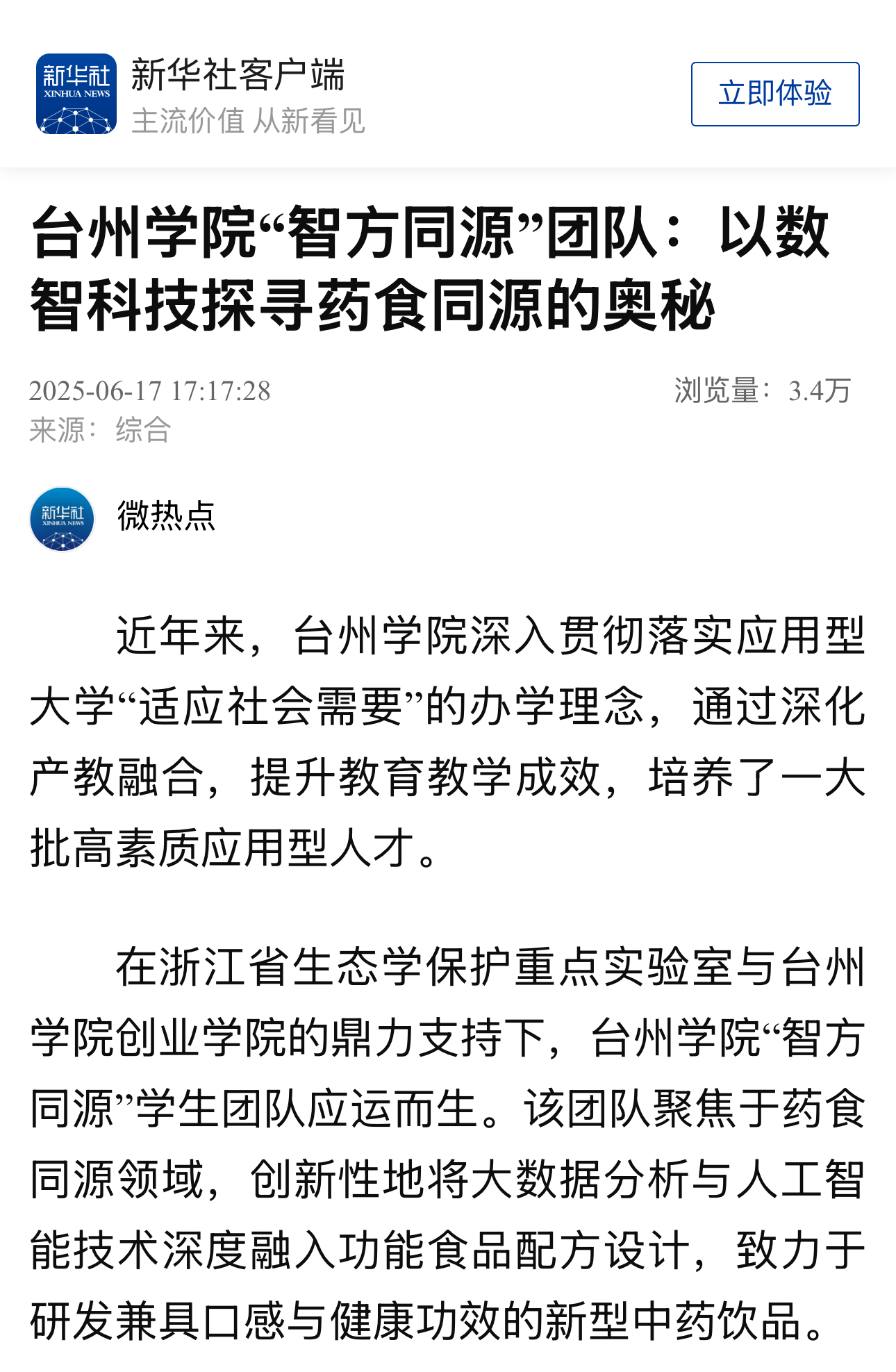 在浙江省生态学保护重点实验室与台州学院创业学院的鼎力支持下,台州学院“智方同源”学生团队应运而生。该团队聚焦于药食同源领域,创新性地将大数据分析与人工智能技术深度融入功能食品配方设计,致力于研发兼具口感与健康功效的新型中药饮品。