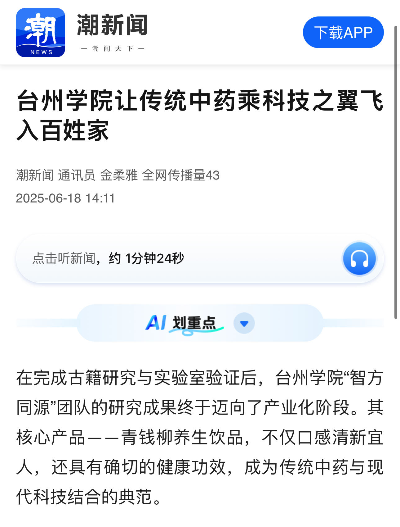 在完成古籍研究与实验室验证后,台州学院“智方同源”团队的研究成果终于迈向了产业化阶段。其核心产品——青钱柳养生饮品,不仅口感清新宜人,还具有确切的健康功效,成为传统中药与现代科技结合的典范。