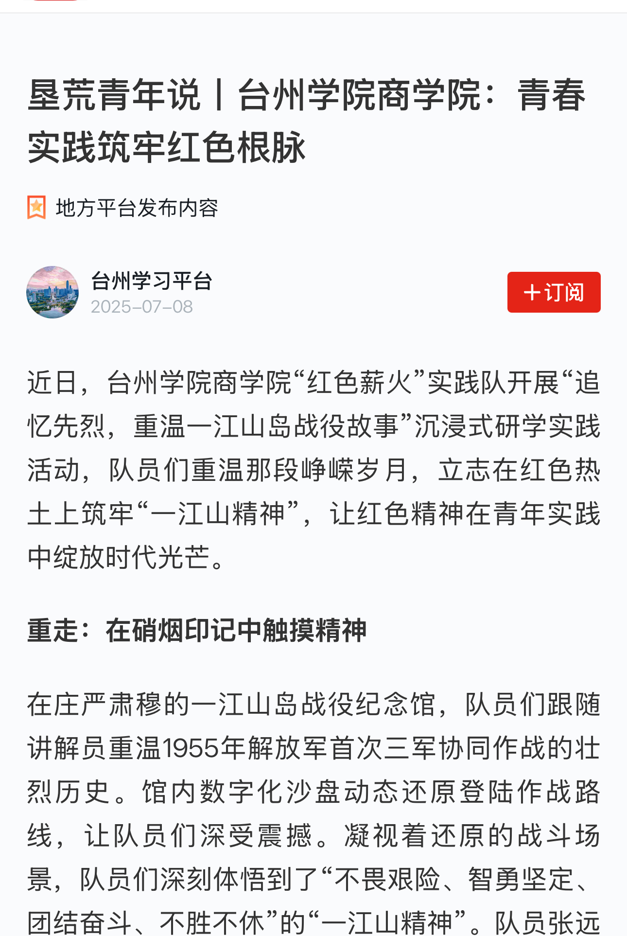 近日,台州学院商学院“红色薪火”实践队开展“追忆先烈,重温一江山岛战役故事”沉浸式研学实践活动,队员们重温那段峥嵘岁月,立志在红色热土上筑牢“一江山精神”,让红色精神在青年实践中绽放时代光芒。