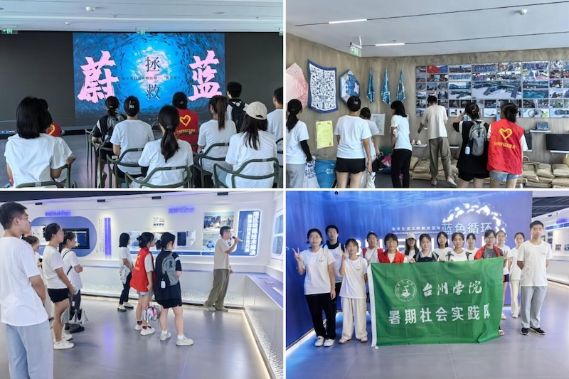 带着调研中的观察与疑问,实践队前往椒江区“蓝色循环”海洋生态文明教育基地进行深度参访。在专业讲解员的带领下,队员们系统了解了海洋垃圾的产生源头、生态危害及其治理挑战。展厅通过创新技术展示,生动呈现了废弃塑料等海洋垃圾如何被转化为再生原料和精美工艺品,让“变废为宝”的理念具象化。此外,一部海洋垃圾循环利用的宣传片,进一步强化了队员们对系统性资源化处理的认识。基地的展品直观印证了垃圾资源化的可行性与经济价值。