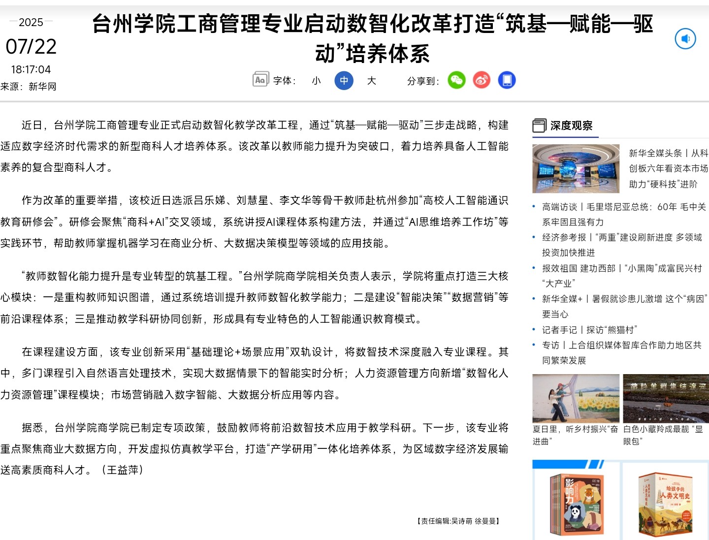 “教师数智化能力提升是专业转型的筑基工程。”台州学院商学院相关负责人表示,学院将重点打造三大核心模块:一是重构教师知识图谱,通过系统培训提升教师数智化教学能力;二是建设“智能决策”“数据营销”等前沿课程体系;三是推动教学科研协同创新,形成具有专业特色的人工智能通识教育模式。