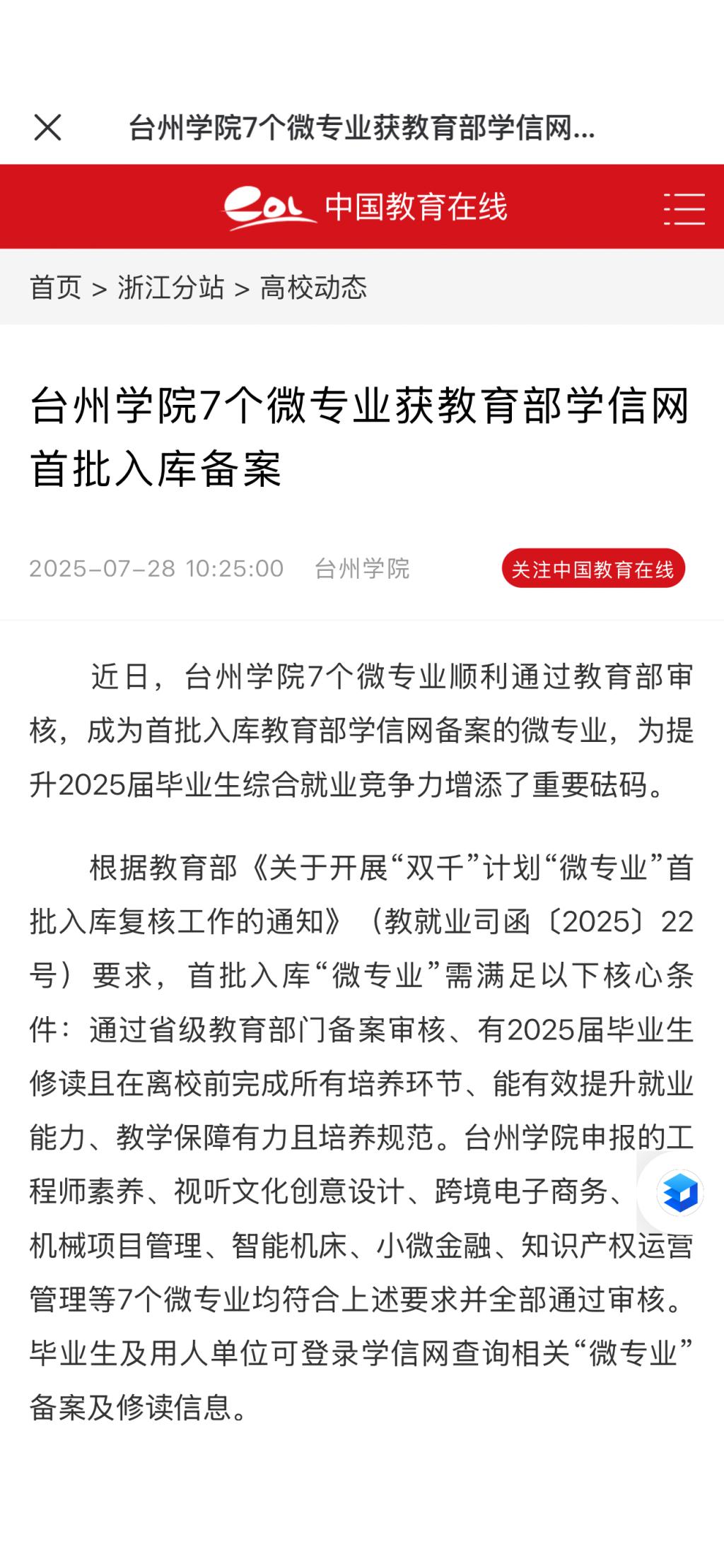 近日,台州学院7个微专业顺利通过教育部审核,成为首批入库教育部学信网备案的微专业,为提升2025届毕业生综合就业竞争力增添了重要砝码。