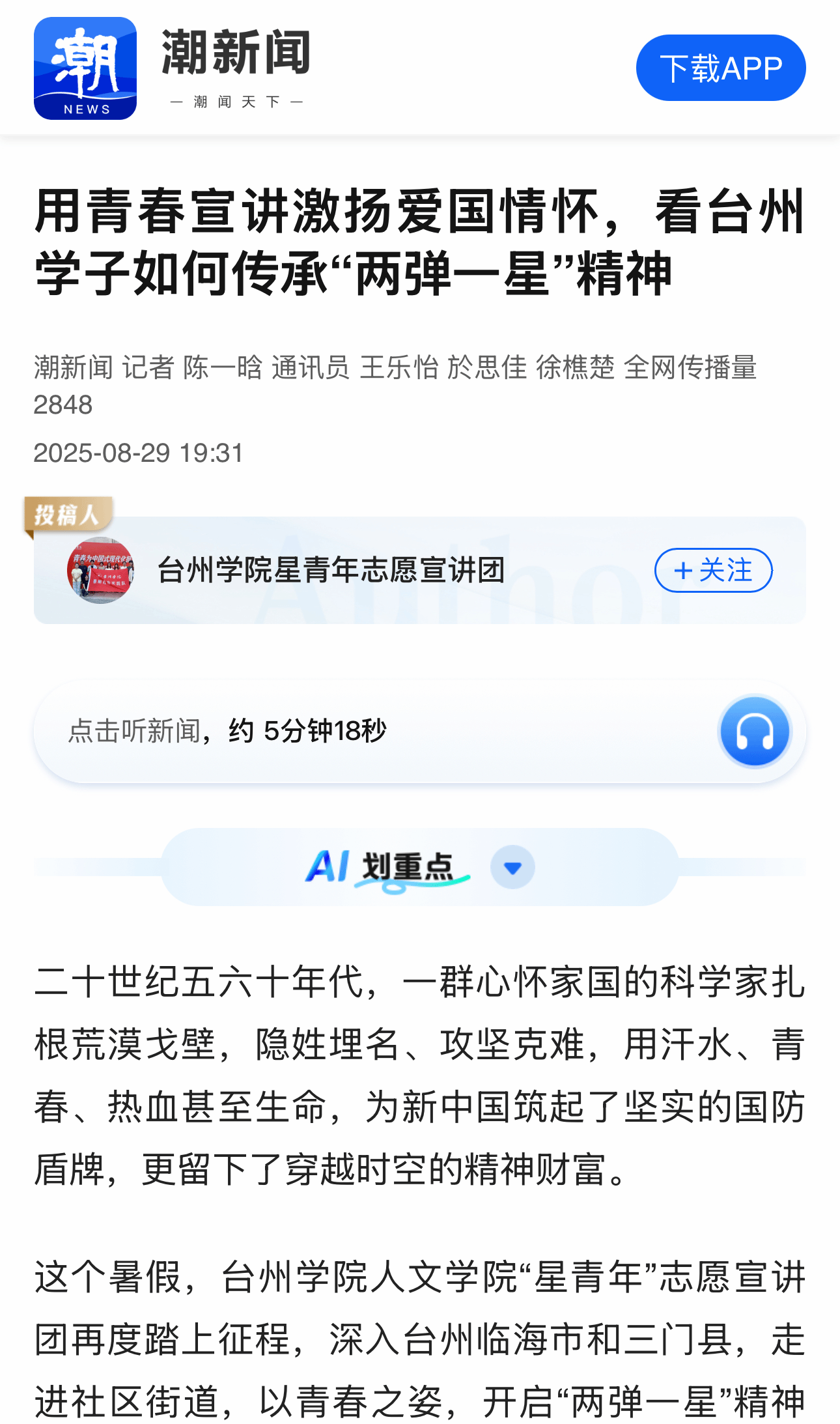 这个暑假,台州学院人文学院“星青年”志愿宣讲团再度踏上征程,深入台州临海市和三门县,走进社区街道,以青春之姿,开启“两弹一星”精神宣讲之旅,将红色文脉的火种播撒到更广阔的大地。