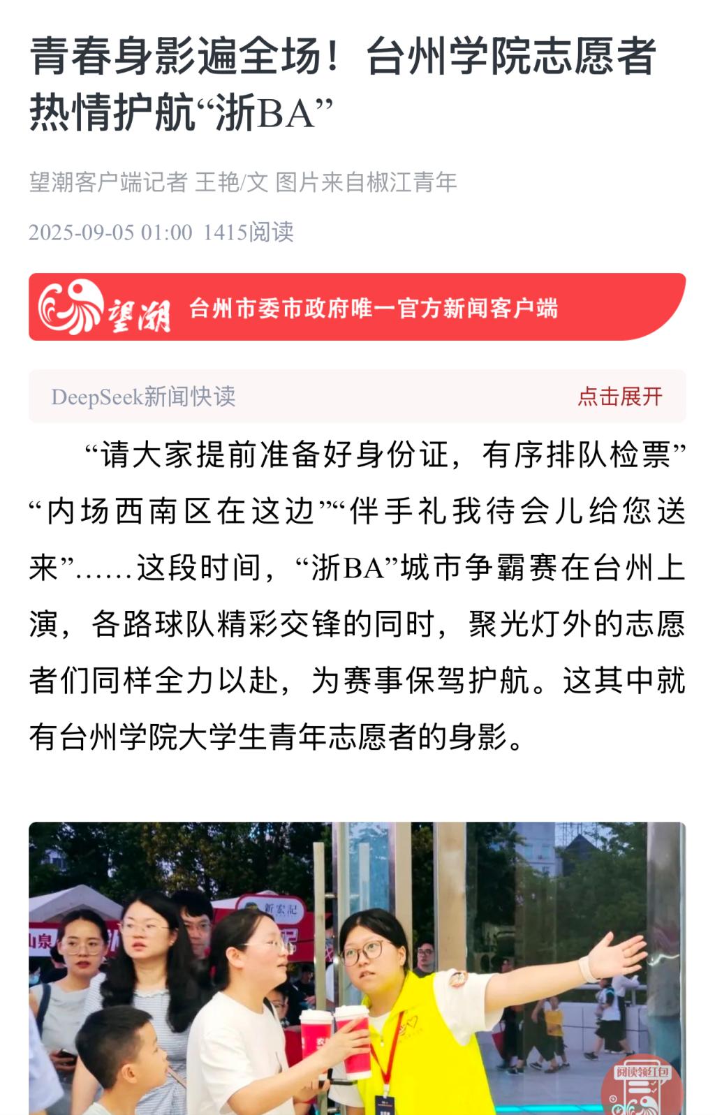 记者了解到,此前台州学院志愿者也曾助力过省五体会、台州马拉松、亚运火炬传递等大型活动及赛事,体现了台州学院青年学子的责任与担当。此次“浙BA”开赛以来,台州学院同样全力支持,多次招募大学生志愿者参与。其间,有不少大学生是自发利用暑期时间做志愿者,也有大学生累计参与多场比赛,用青春行动贡献台院力量。