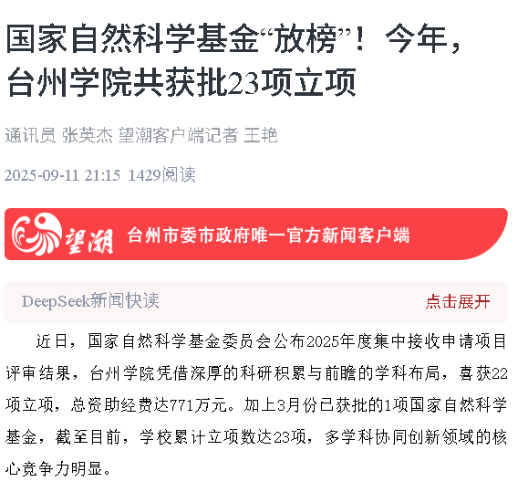 国家自然科学基金“放榜”!今年,台州学院共获批23项立项
