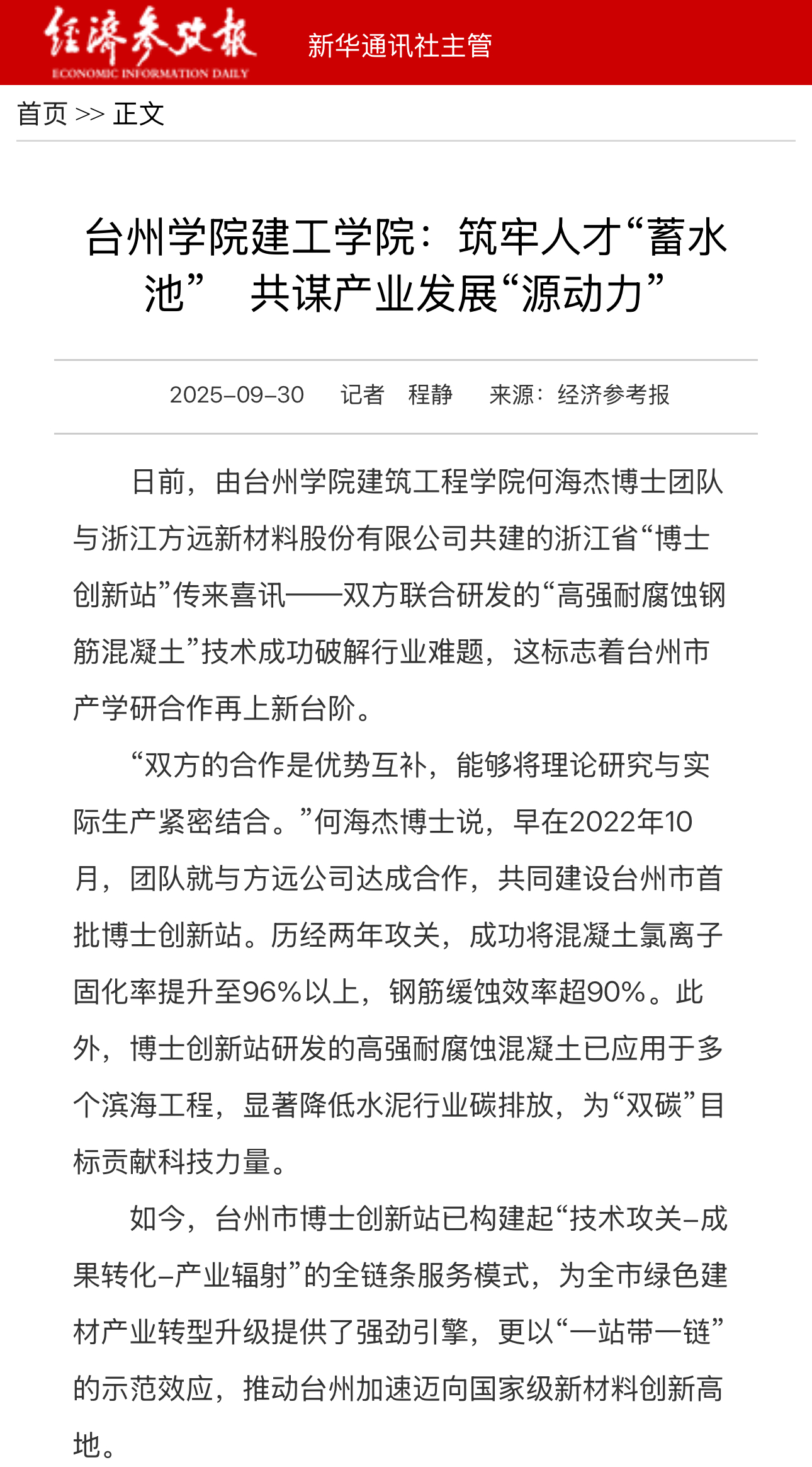 日前,由台州学院建筑工程学院何海杰博士团队与浙江方远新材料股份有限公司共建的浙江省“博士创新站”传来喜讯——双方联合研发的“高强耐腐蚀钢筋混凝土”技术成功破解行业难题,这标志着台州市产学研合作再上新台阶。