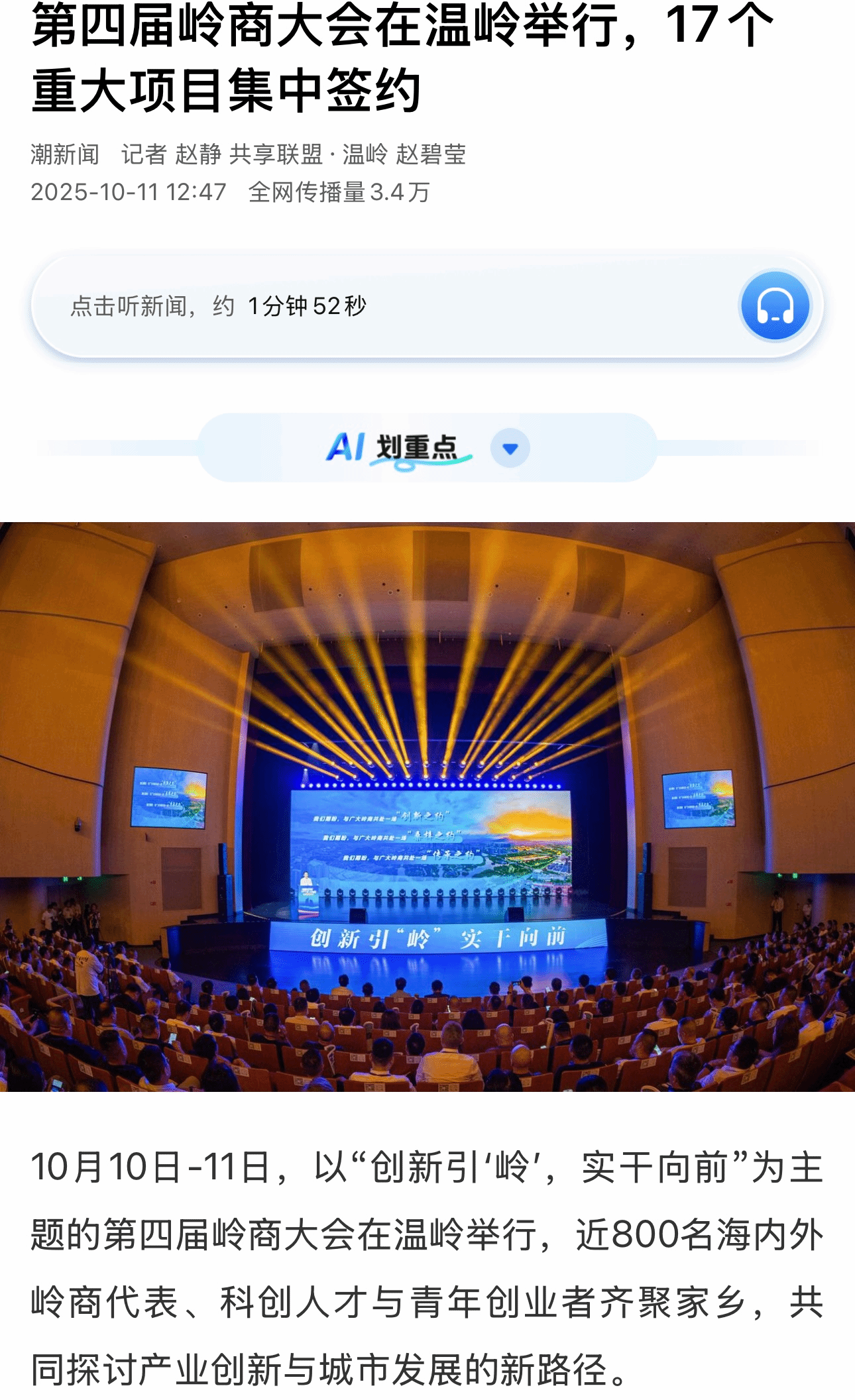 10月10日-11日,以“创新引‘岭’,实干向前”为主题的第四届岭商大会在温岭举行,近800名海内外岭商代表、科创人才与青年创业者齐聚家乡,共同探讨产业创新与城市发展的新路径。