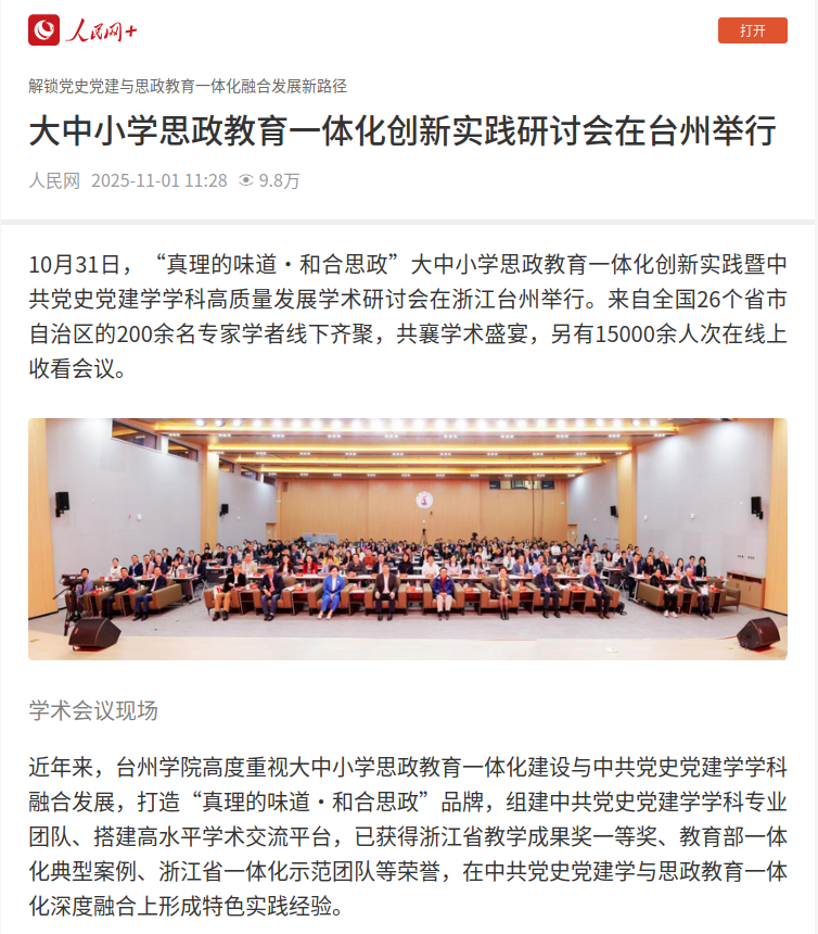 近年来,台州学院高度重视大中小学思政教育一体化建设与中共党史党建学学科融合发展,打造“真理的味道・和合思政”品牌,组建中共党史党建学学科专业团队、搭建高水平学术交流平台,已获得浙江省教学成果奖一等奖、教育部一体化典型案例、浙江省一体化示范团队等荣誉,在中共党史党建学与思政教育一体化深度融合上形成特色实践经验。