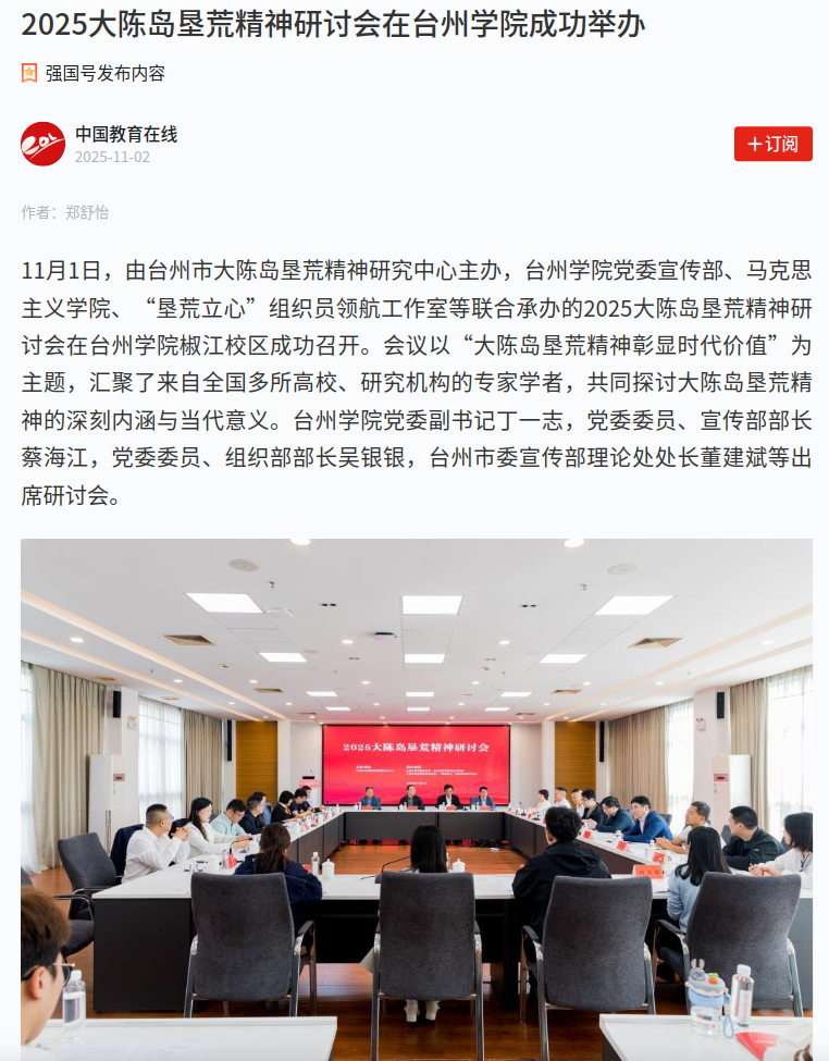 作为主要依托于台州学院的台州市大陈岛垦荒精神研究中心,近年来持续深化理论研究与社科普及,协同攻关了“浙江省文化研究工程”等一批具有重要影响力的课题项目,申报获评了浙江省教学成果奖一等奖,建设获批了教育部红色文化弘扬基地、浙江省新时代高校思政课教师研修基地,已成为区域红色文化研究、阐释和传承的重要平台。本次研讨会的成功举办,不仅深化了大陈岛垦荒精神的传承弘扬,也为台州城市精神的阐释践行提供了强大的学理和实践支撑。
