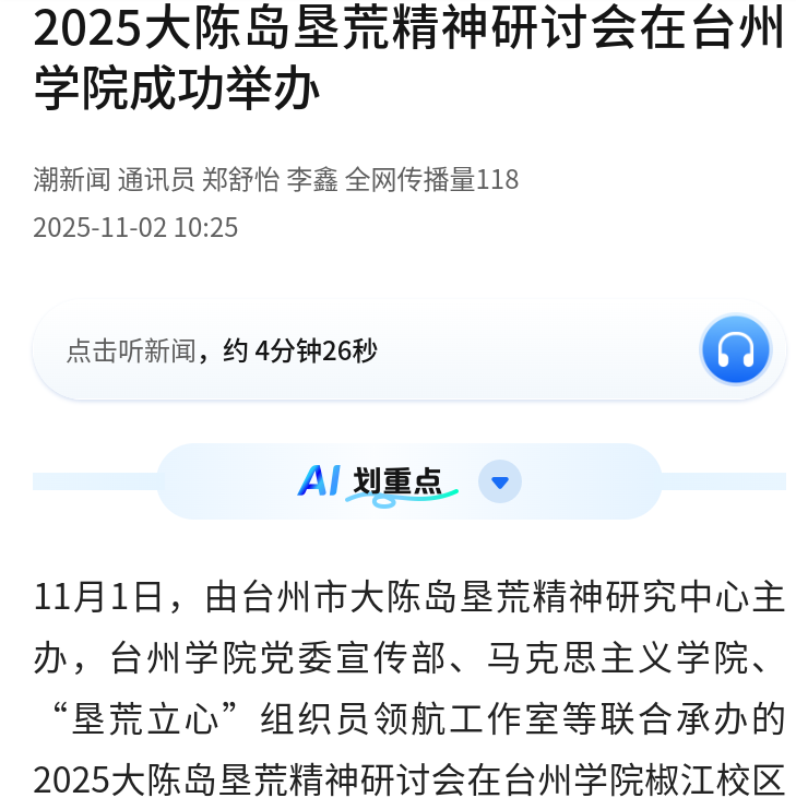 作为主要依托于台州学院的台州市大陈岛垦荒精神研究中心,近年来持续深化理论研究与社科普及,协同攻关了“浙江省文化研究工程”等一批具有重要影响力的课题项目,申报获评了浙江省教学成果奖一等奖,建设获批了教育部红色文化弘扬基地、浙江省新时代高校思政课教师研修基地,已成为区域红色文化研究、阐释和传承的重要平台。本次研讨会的成功举办,不仅深化了大陈岛垦荒精神的传承弘扬,也为台州城市精神的阐释践行提供了强大的学理和实践支撑。
