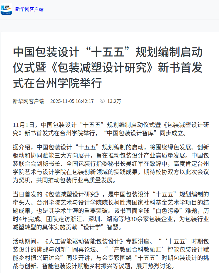 11月1日,中国包装设计“十五五”规划编制启动仪式暨《包装减塑设计研究》新书首发式在台州学院举行,“中国包装设计智库”同步成立。
