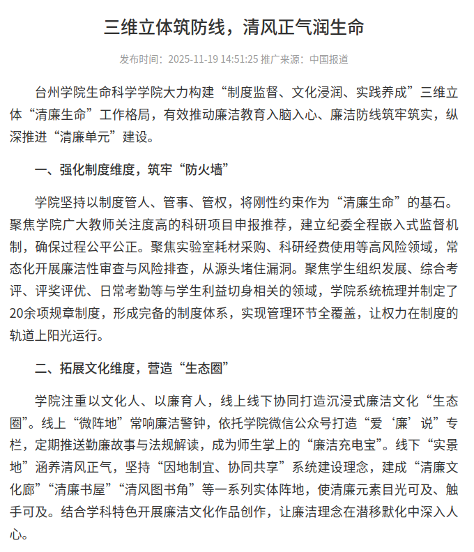 台州学院生命科学学院大力构建“制度监督、文化浸润、实践养成”三维立体“清廉生命”工作格局,有效推动廉洁教育入脑入心、廉洁防线筑牢筑实,纵深推进“清廉单元”建设。