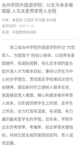 浙江省台州学院外国语学院牢记“为党育人、为国育才”的初心使命,以培养有家国情怀、有国际视野、有扎实本领的复合型外语人才为根本目标,秉持以学生为中心的办学理念,贯彻落实学校第四次党代会精神,紧扣新时代立德树人根本任务,直面基层育人难题,精心构建多维并举育人体系,切实做到想学生之所想、急学生之所急,全力打造有温度、有深度、有力量的最关爱学生的学院。近年来,学院毕业生的考研率、考编率、就业率等关键指标,持续位居全省同类院校前列,育人成效显著。