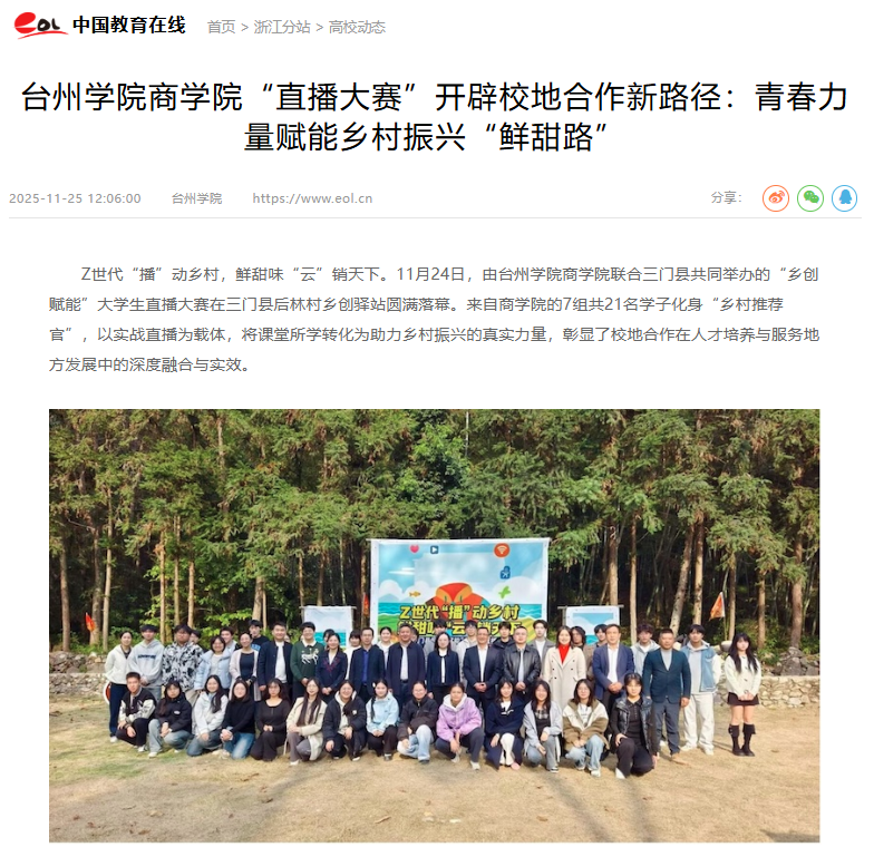 Z世代“播”动乡村,鲜甜味“云”销天下。11月24日,由台州学院商学院联合三门县共同举办的“乡创赋能”大学生直播大赛在三门县后林村乡创驿站圆满落幕。来自商学院的7组共21名学子化身“乡村推荐官”,以实战直播为载体,将课堂所学转化为助力乡村振兴的真实力量,彰显了校地合作在人才培养与服务地方发展中的深度融合与实效。