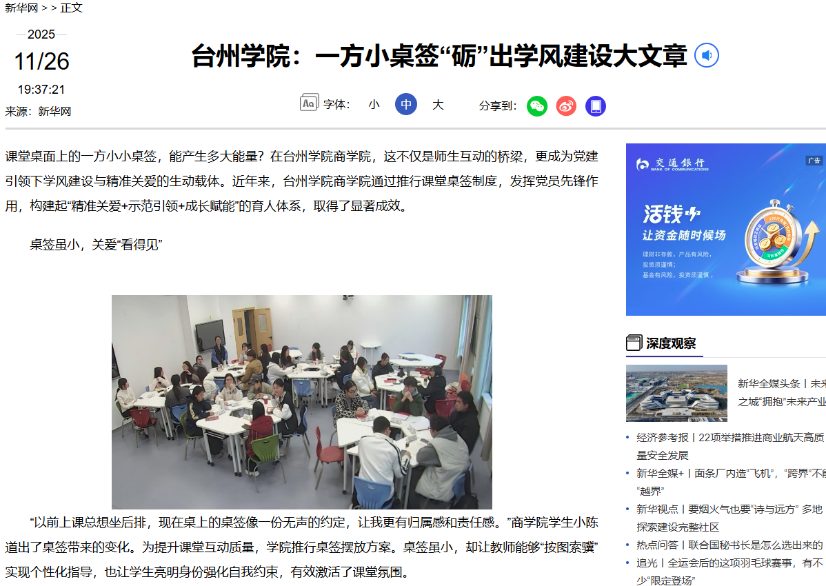 课堂桌面上的一方小小桌签,能产生多大能量?在台州学院商学院,这不仅是师生互动的桥梁,更成为党建引领下学风建设与精准关爱的生动载体。近年来,台州学院商学院通过推行课堂桌签制度,发挥党员先锋作用,构建起“精准关爱+示范引领+成长赋能”的育人体系,取得了显著成效。
