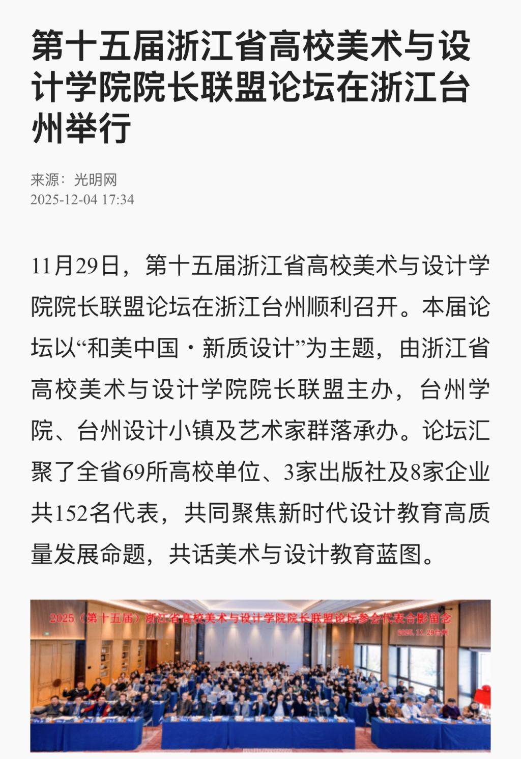 11月29日,第十五届浙江省高校美术与设计学院院长联盟论坛在浙江台州顺利召开。本届论坛以“和美中国・新质设计”为主题,由浙江省高校美术与设计学院院长联盟主办,台州学院、台州设计小镇及艺术家群落承办。论坛汇聚了全省69所高校单位、3家出版社及8家企业共152名代表,共同聚焦新时代设计教育高质量发展命题,共话美术与设计教育蓝图。