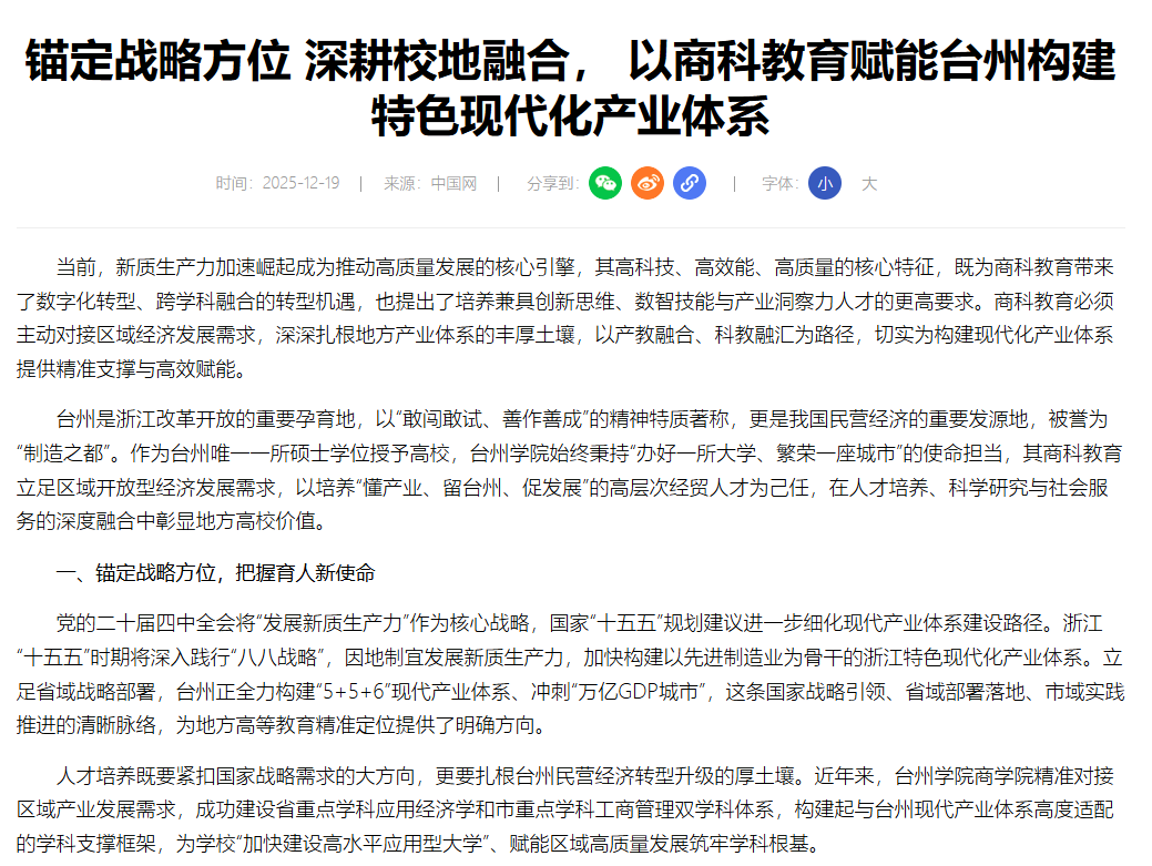商科教育要从“全会精神”中感悟“时代使命”,从台州高质量发展的“生动图景”中看见“美好未来”,切实扛起高等教育服务地方的使命担当。核心要义在于全力打通从校园到产业、从学业到事业的最后一公里,持续深耕校地融合、产教融合,让商科教育更贴近台州经济的脉搏,让人才培养更响应产业变革的哨音,激发青年人才建设台州、扎根台州的热忱与能力。