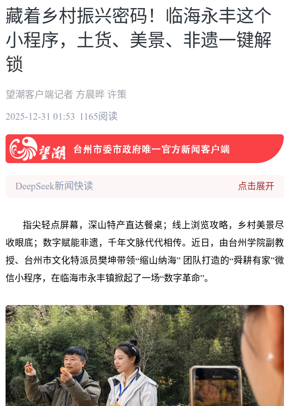 指尖轻点屏幕,深山特产直达餐桌;线上浏览攻略,乡村美景尽收眼底;数字赋能非遗,千年文脉代代相传。近日,由台州学院副教授、台州市文化特派员樊坤带领“缩山纳海”团队打造的“舜耕有家”微信小程序,在临海市永丰镇掀起了一场“数字革命”。