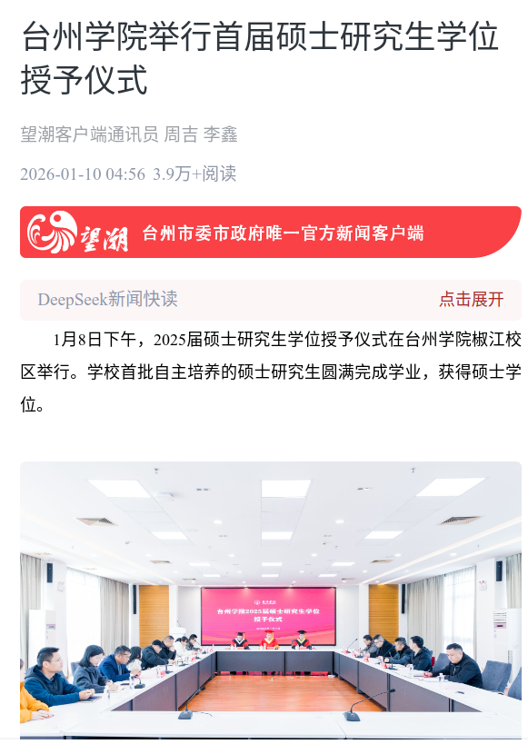1月8日下午,2025届硕士研究生学位授予仪式在台州学院椒江校区举行。学校首批自主培养的硕士研究生圆满完成学业,获得硕士学位。